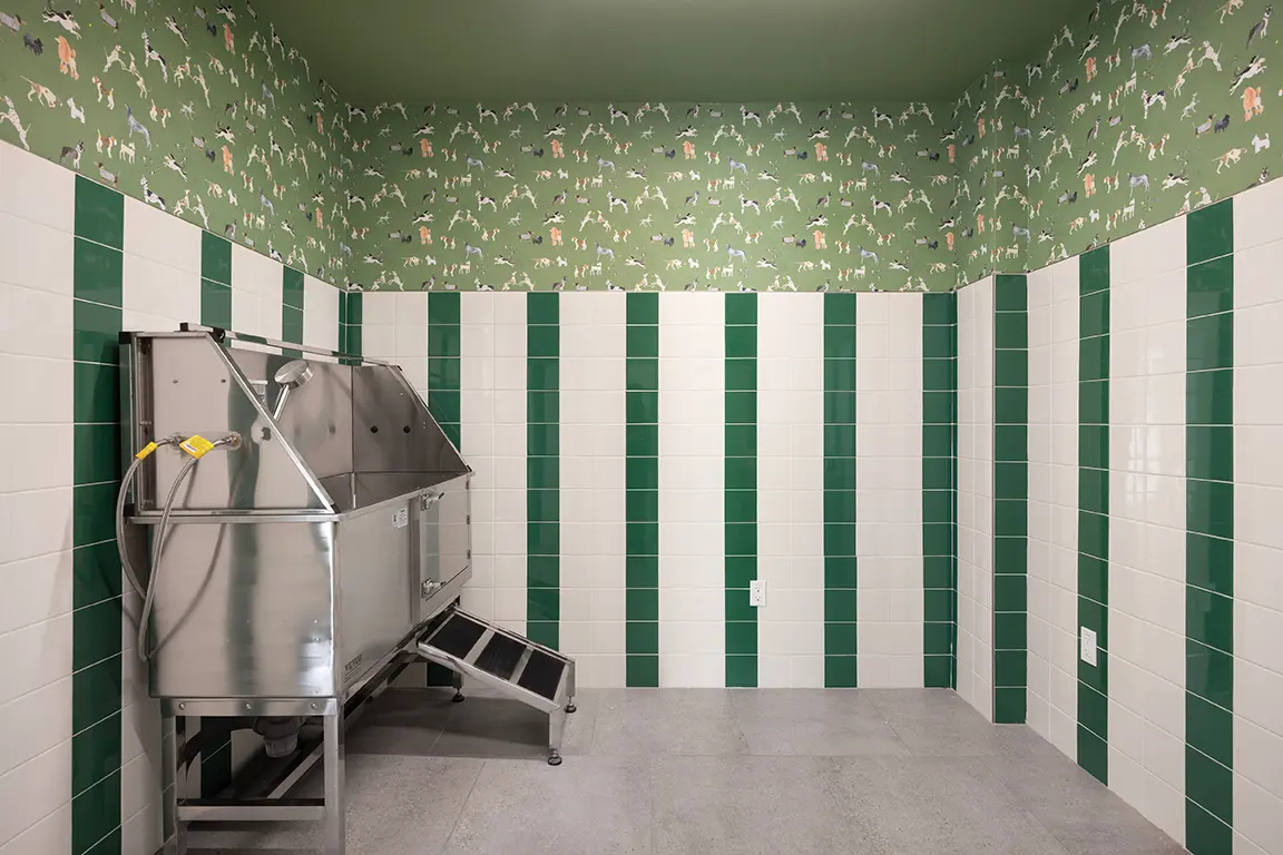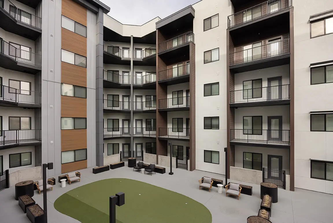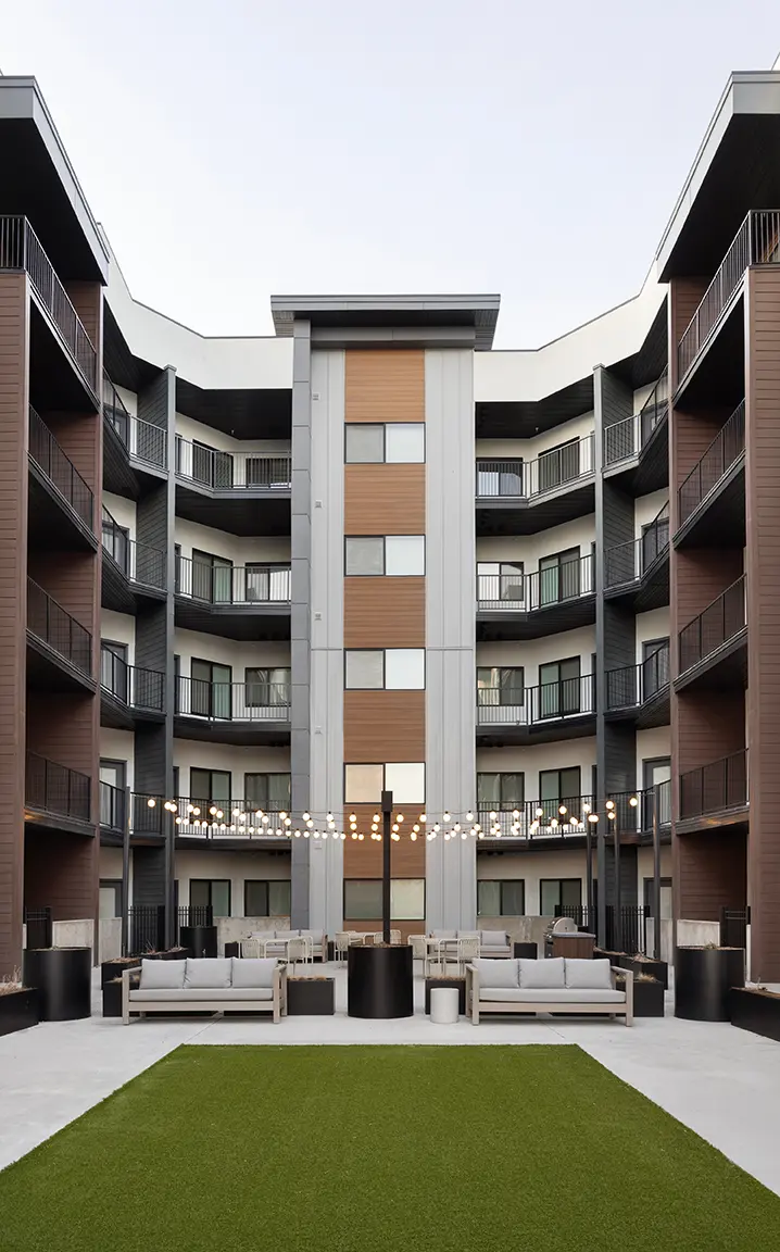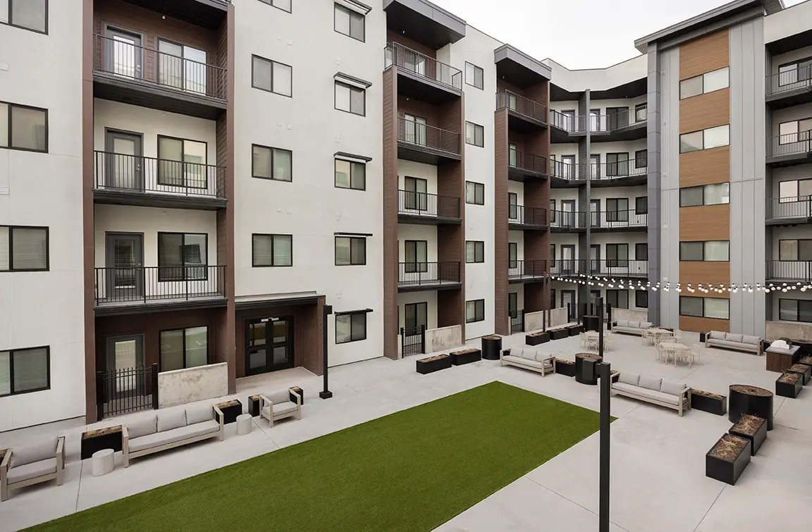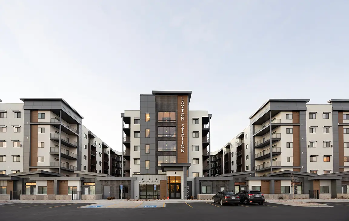 Layton Station is a 252-unit, five-story residential community built atop a concrete podium that integrates parking and shared amenity spaces. The podium structure supports a range of resident amenities, including an outdoor pool and hot tub, clubhouse, golf simulator, dog wash, and secure bike storage.