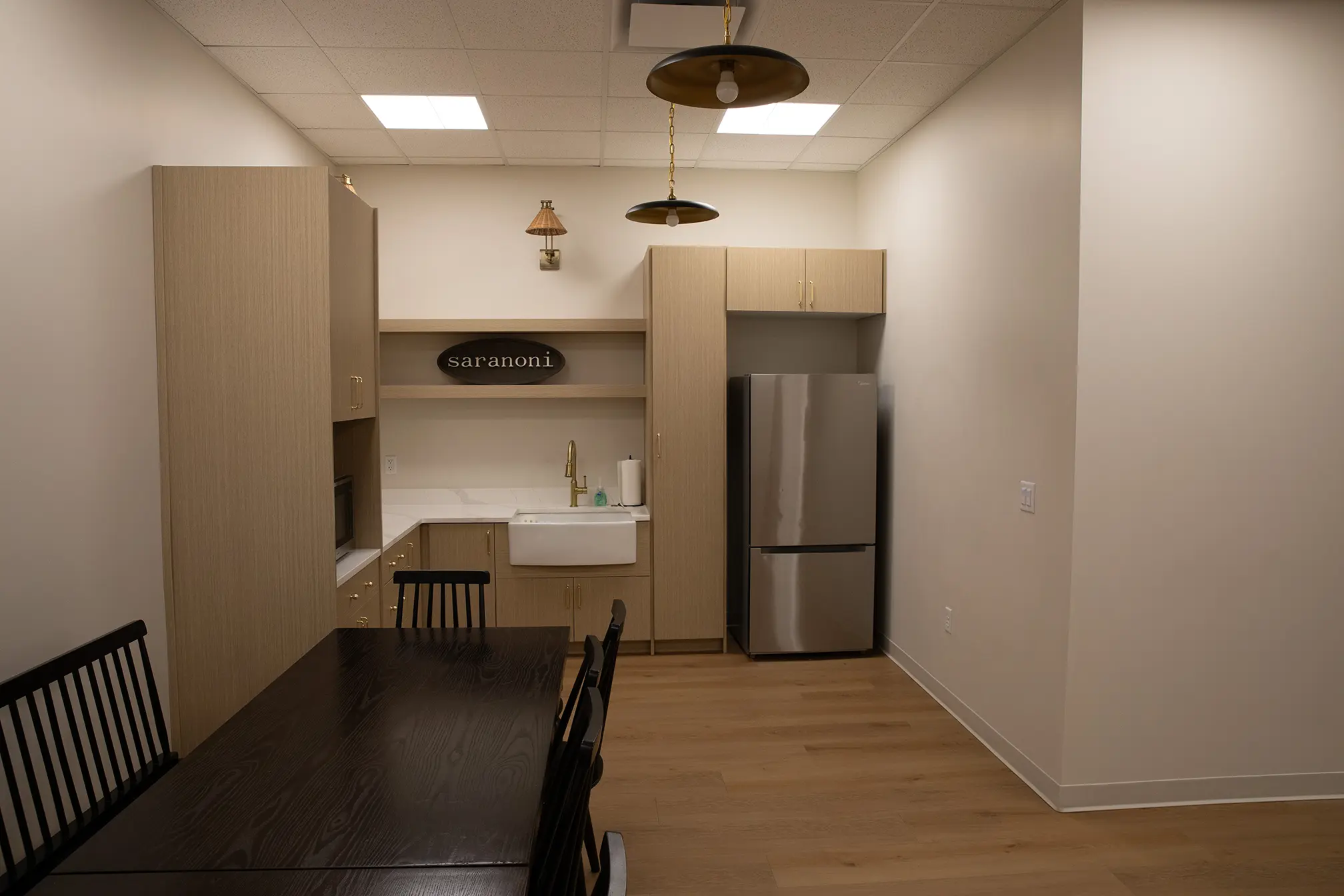 Open offices and meeting rooms create a cohesive, inviting workspace where comfort, efficiency, and style come together — a true reflection of the Saranoni brand.